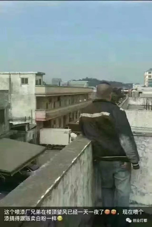 今天,全古鎮燈飾人的微信朋友圈都被這個被譽為榮獲“2016年度燈飾行業奧斯卡最佳攝影獎”的背影刷屏了----“這個噴漆廠兄弟在樓頂望風已經一天一夜了,現在噴個漆搞得跟販賣白粉一樣”!