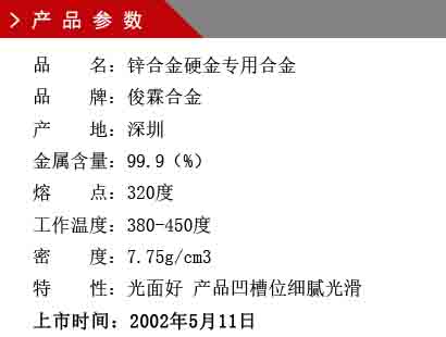 俊霖鋅合金硬金專用合金是由鋅金屬合成,再配以銅鋁鎂等微量元素融合,具備材質軟硬適度,光面好,易修胚,焊接拋光電鍍效果佳;綜合原有鉛基合金、鋅合金產品的優良之處,解決了原鉛錫合金材料高成本,流動性不夠,產品硬度韌性欠缺、后期工藝難處理的現象。